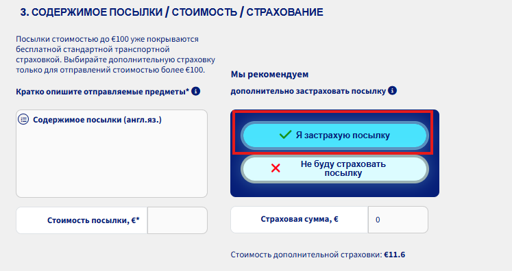 После выбора услуги заполните данные отправителя и получателя. Затем, на третьем шаге, опишите содержимое отправления на английском языке и укажите его стоимость. Здесь же вы увидите наше предложение — выбрать дополнительную защиту (см. изображение ниже). Здесь можно указать страховую сумму и оформить дополнительное страхование, которое обеспечит вам спокойствие за вашу ценную посылку.